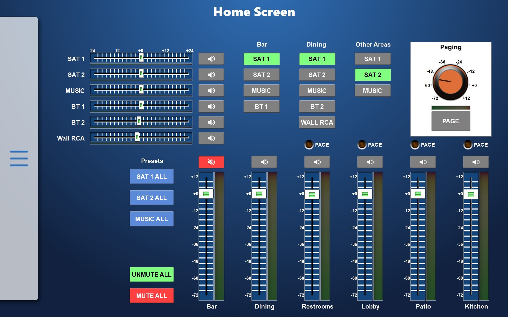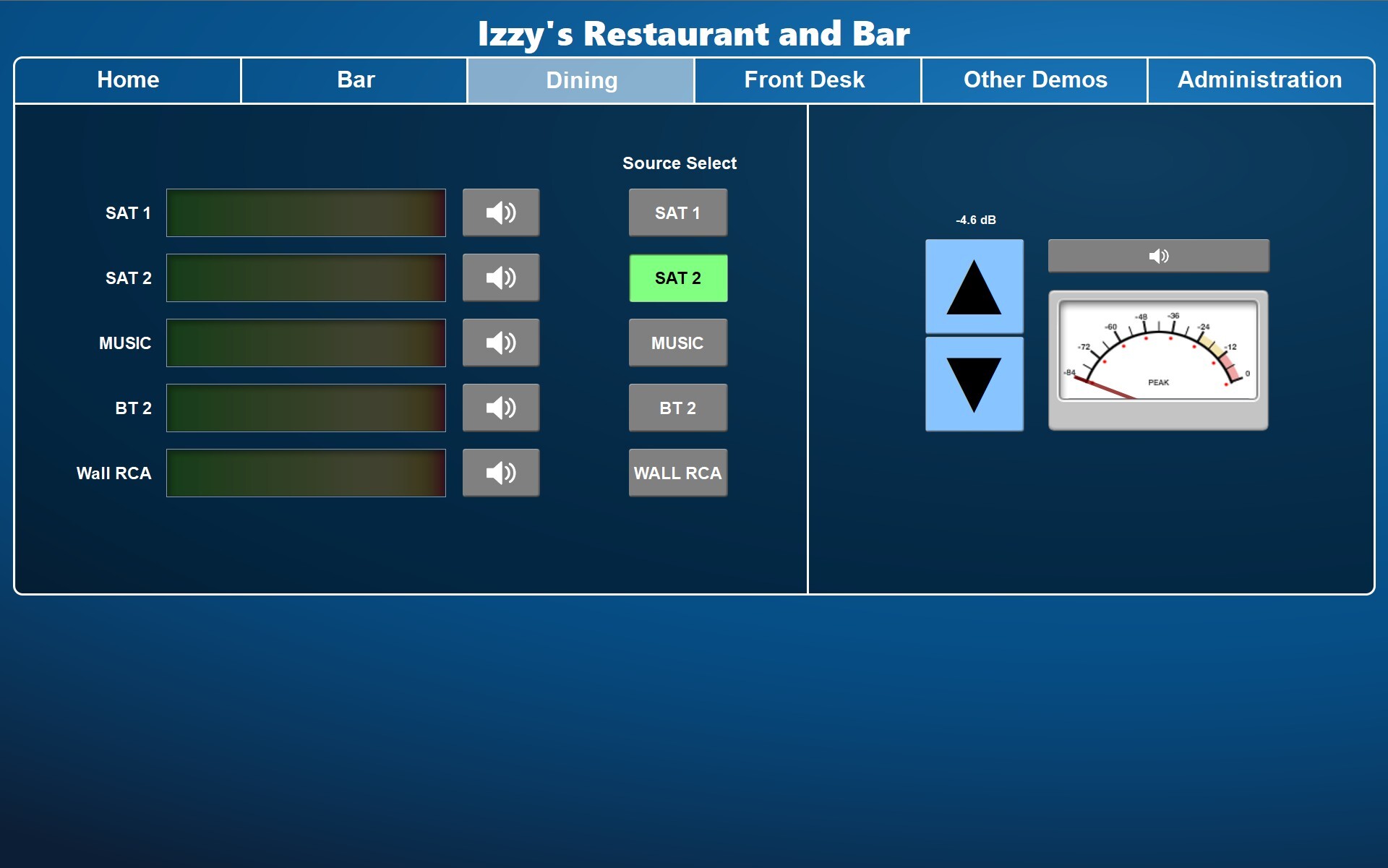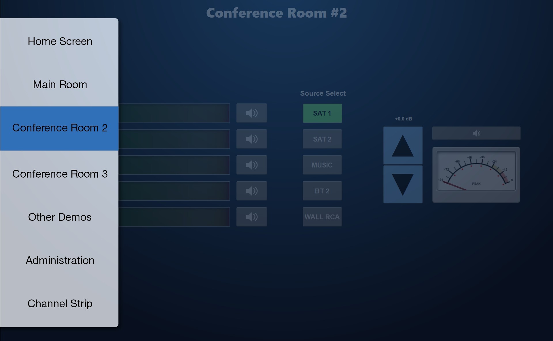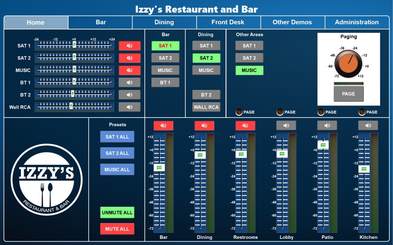 T-Series touchscreens can be located anywhere that is convenient for users to access their AV systems. Control screens can include a variety of parameters, display branding, and provide easy-to-use buttons, sliders, and navigation.